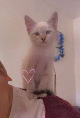Petite chatte d’environ 2 mois et demi, blanche yeux bleus, un peu tigrée au visage et la queue grise.