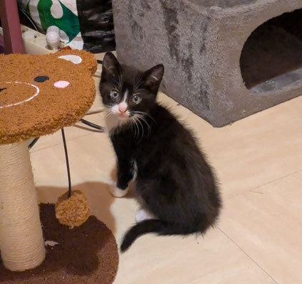 Jeune chatte très timide au départ, mais une fois en confiance elle devient câline, joueuse, affectueuse.