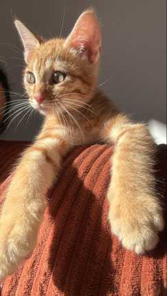 CESAR se porte à merveille. Il joue énormément (il est fan de tout ce qui a une ficelle). Il adore les séances de pétrissage au soleil mais aussi regarder les reportages animaliers à la télé, au chaud dans son fauteuil.