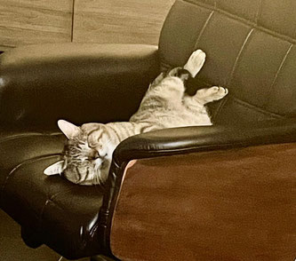 En journée, elle reste au frais sous un lit, installée sur une chaise ou sous la table pour dormir.